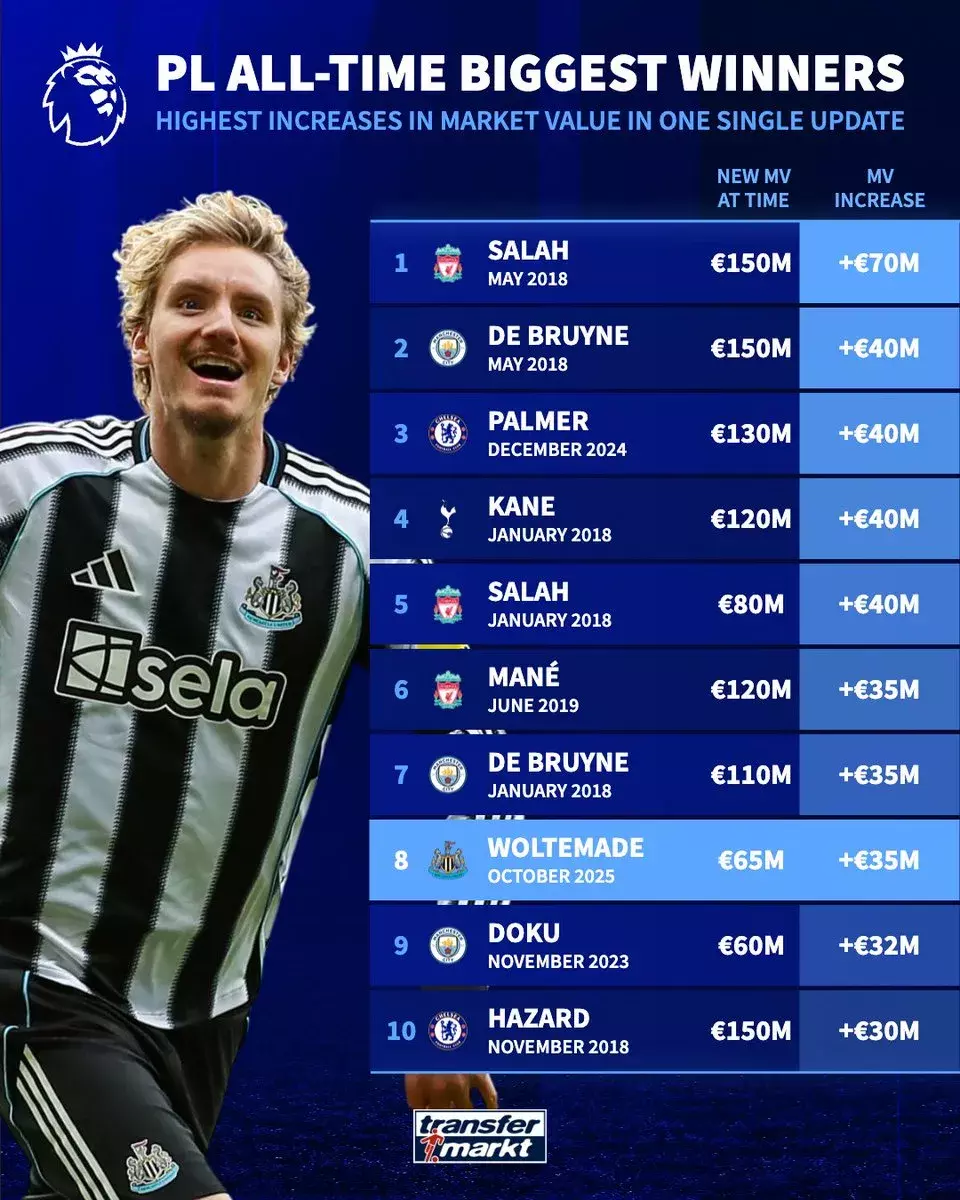 近日,德转更新了英超球员的身价。本次更新中,纽卡新援尼克-沃尔特马德的身价从3000万欧暴涨至6500万欧,涨幅位列本次更新榜首。